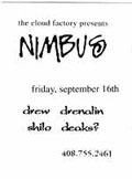 Nimbus was our last party of the summer. It took place outside of Castroville, probably actually in Moss Landing. The Cloud Factory was only several hundred yards away! Dj's during the night were Deaks, drenalin [my debut], Shilo, Drew, X-man, and a couple others in the morning [I believe one of them was Jamie]. Although the vibe thruout the night was a little strange the event went off without a hitch, except for Mark messing up the sound! [Hint don't ever let Mark Jones do sound for you].